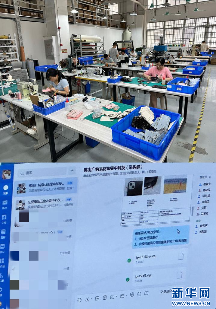 上圖為Custype手機殼打樣工廠;下圖為雯中科技搭建的采購群。新華網(wǎng) 關(guān)錦恒 攝