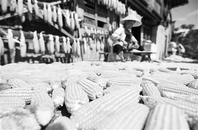 8月11日,在貴州省黔東南苗族侗族自治州從江縣往洞鎮(zhèn)增沖村,村民在晾曬玉米。新華社發(fā)(羅京來攝)