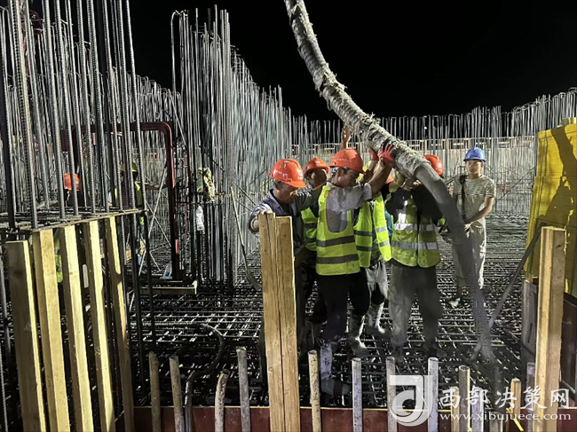 九層之臺(tái),始于壘土。筏板作為基礎(chǔ)工程最重要的組成部分,其質(zhì)量的好壞直接影響到上部結(jié)構(gòu)的穩(wěn)固性。在完成筏板鋼筋綁扎后,2臺(tái)長臂泵車、34輛混凝土罐車開始送料。澆筑期間,映入眼簾的是一片繁忙之景,22名管理人員,110余名勞務(wù)人員正以時(shí)不我待的緊迫感,全力以赴抓緊抓實(shí)項(xiàng)目建設(shè),共同助力項(xiàng)目建設(shè)跑出加速度。