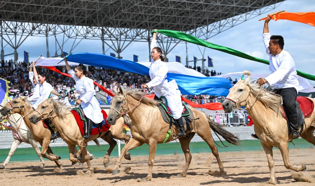 8月9日,2023興安盟那達(dá)慕在烏蘭毛都草原開幕,這是演員在開幕式上進(jìn)行表演。新華社記者 貝赫 攝