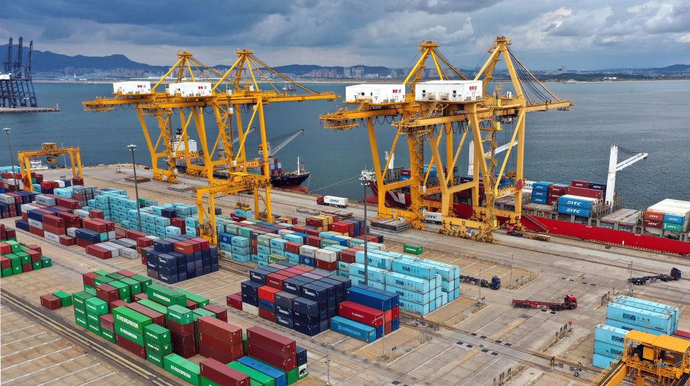 △在遼寧大連市遼寧港口集團(tuán)大連港集裝箱碼頭,貨輪在裝卸集裝箱。