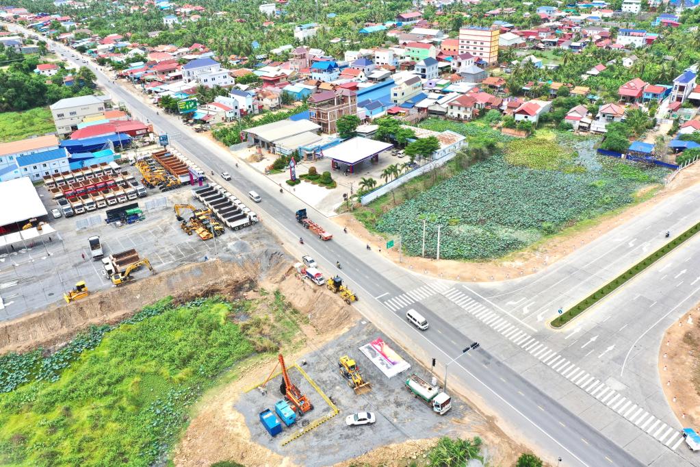 這是6月5日在柬埔寨干丹省拍攝的金巴高速公路施工起點(無人機(jī)照片)。