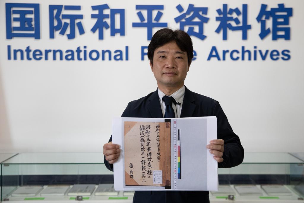6月1日,在黑龍江外國語學院國際和平資料館,日本學者松野誠也展示新發(fā)現(xiàn)的資料。此前,黑龍江外國語學院和侵華日軍第七三一部隊罪證陳列館聯(lián)合在哈爾濱市向社會公布了一批部隊編制資料。這些資料包括關(guān)東軍防疫給水部軍官高等文官職員表、判任文官同待遇者職員表等。新華社記者張濤攝
