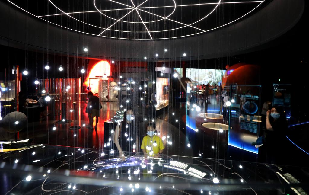參觀(guān)者在上海天文館“家園”展區(qū)內(nèi)一個(gè)名為“太陽(yáng)的鄰居”的裝置展品前駐足觀(guān)看。新華社記者 方喆 攝