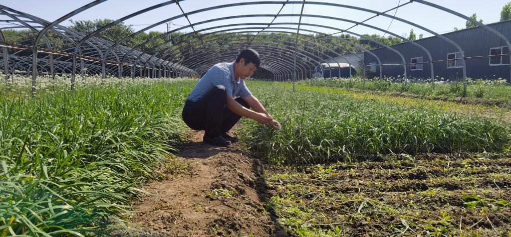 山東省壽光市文家街道西蔡家營村黨支部書記鐘明正在查看即將收獲的韭菜。新華社記者葉婧 攝
