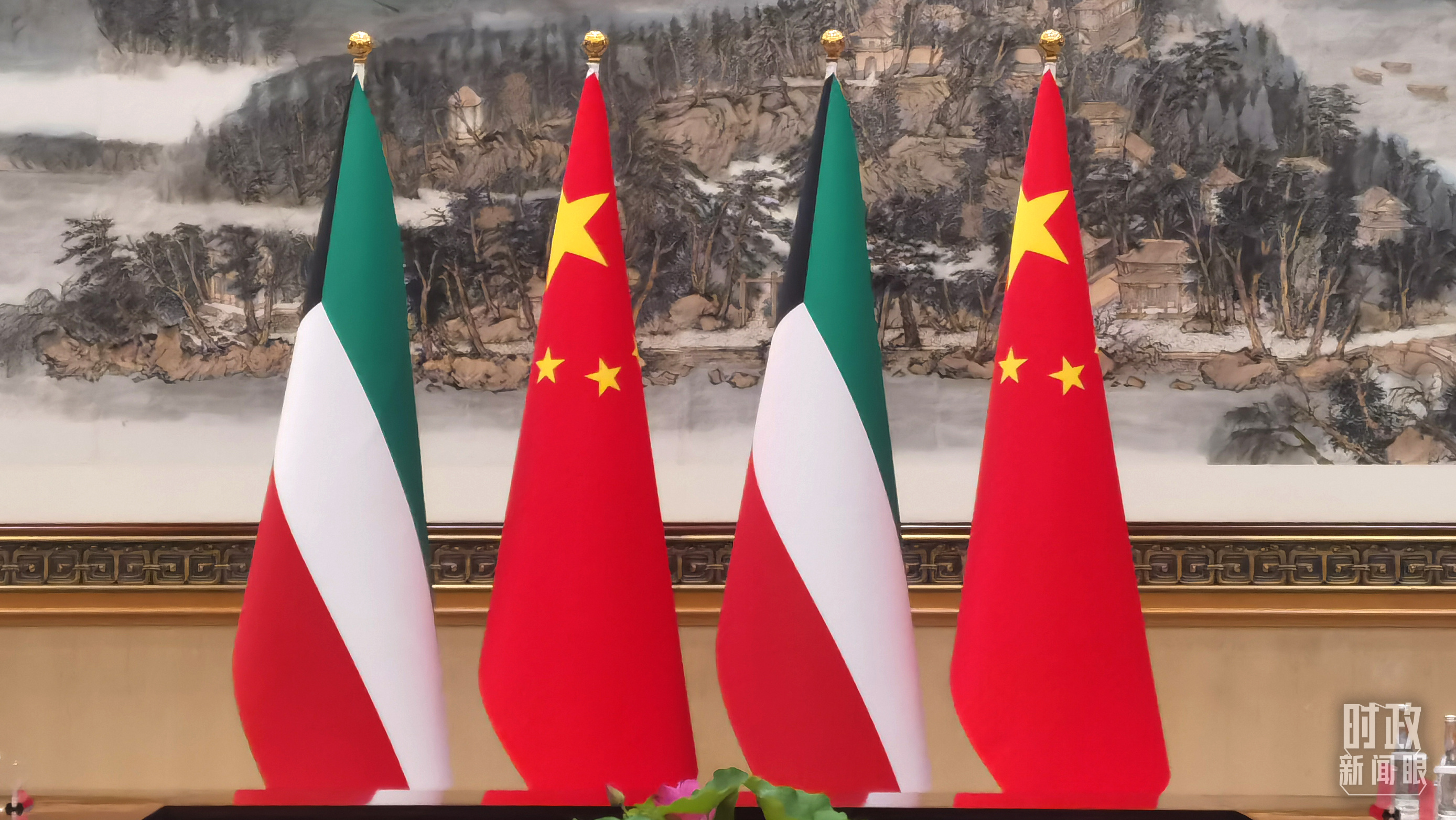 △會(huì)見現(xiàn)場(chǎng)擺放的中國、科威特國旗。(總臺(tái)央視記者曹亞星拍攝)
