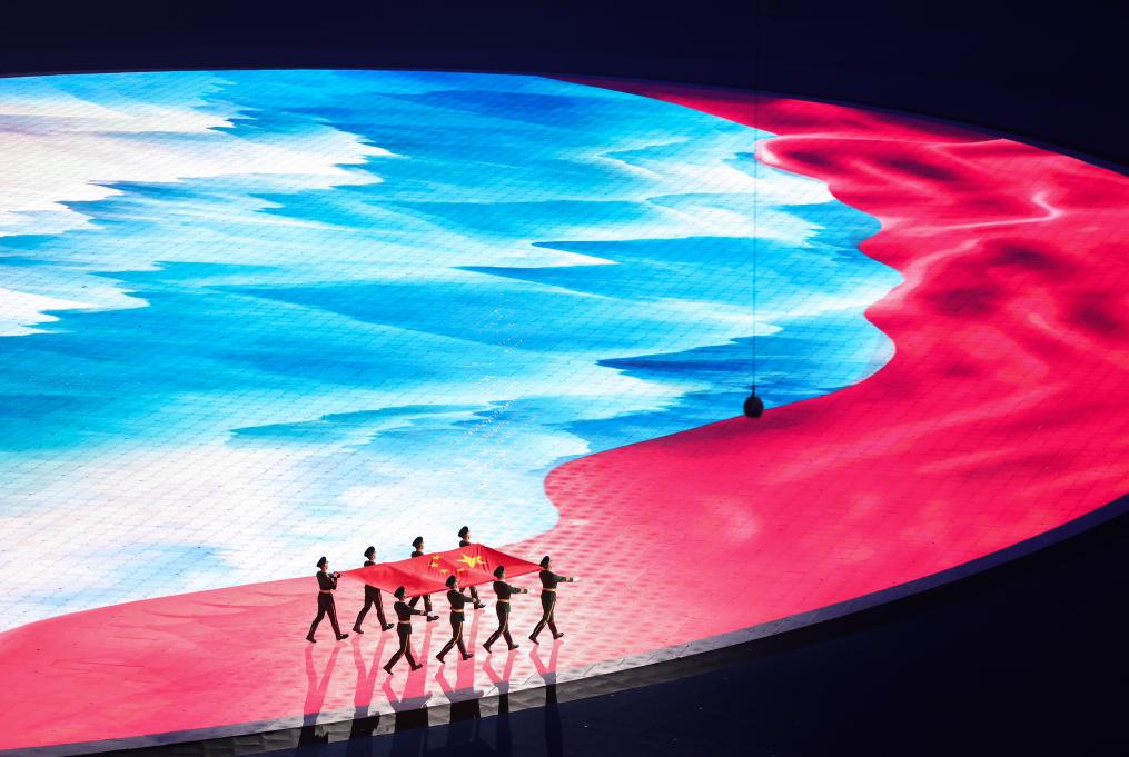 地屏上,一幅紅綢飛掠壯麗河山。8名儀仗兵步伐鏗鏘,護旗入場。“我愛你中國,我愛你春天蓬勃的秧苗……”動人的贊歌深情唱響。