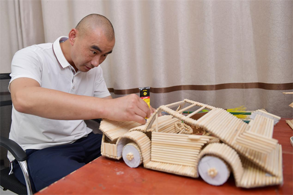 編制了一段時間的小手鏈、小掛件、小燈籠等等小工藝品后,楊波購買了一次性筷子自己做了一個煙盒。這個煙盒只要一按按鈕,煙支就會自動彈出,而且煙嘴朝上。隨后,楊波又購買了許多一次性筷子,做一輛轎車模型,不曾想,等到了安裝擋風(fēng)玻璃時,小轎車散架了。分析原因,是因為圓柱狀筷子之間的粘和面積太小不牢靠。楊波找了一些紙板當(dāng)墊板,使筷子的粘和面變成2處,牢固程度提高1倍,前前后后有10多天,一輛筷子車模做成功了。