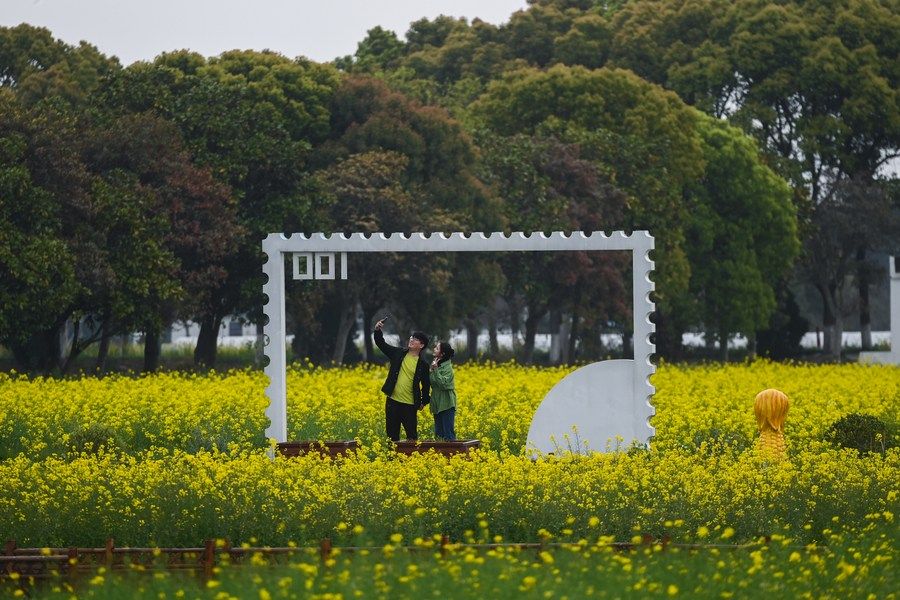 游客在浙江嘉興市秀洲區(qū)王店鎮(zhèn)鎮(zhèn)中村的“青青樂地”農(nóng)耕文化園內(nèi)游玩(2023年4月3日攝)。