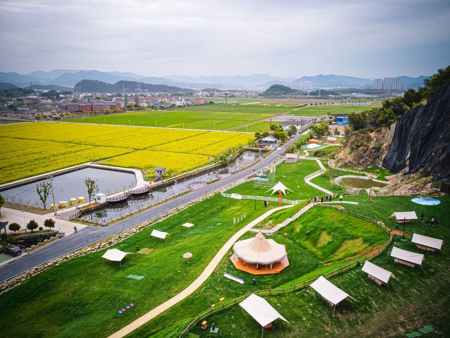 浙江省諸暨市楓橋鎮(zhèn)杜黃新村用廢棄礦山改造的露營旅游地(2023年3月29日攝)。