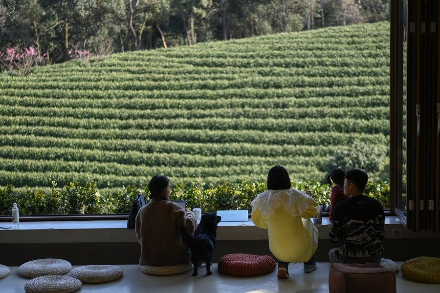 游客在浙江省安吉縣黃杜村萬畝茶園邊的咖啡館休閑(2023年2月21日攝)。