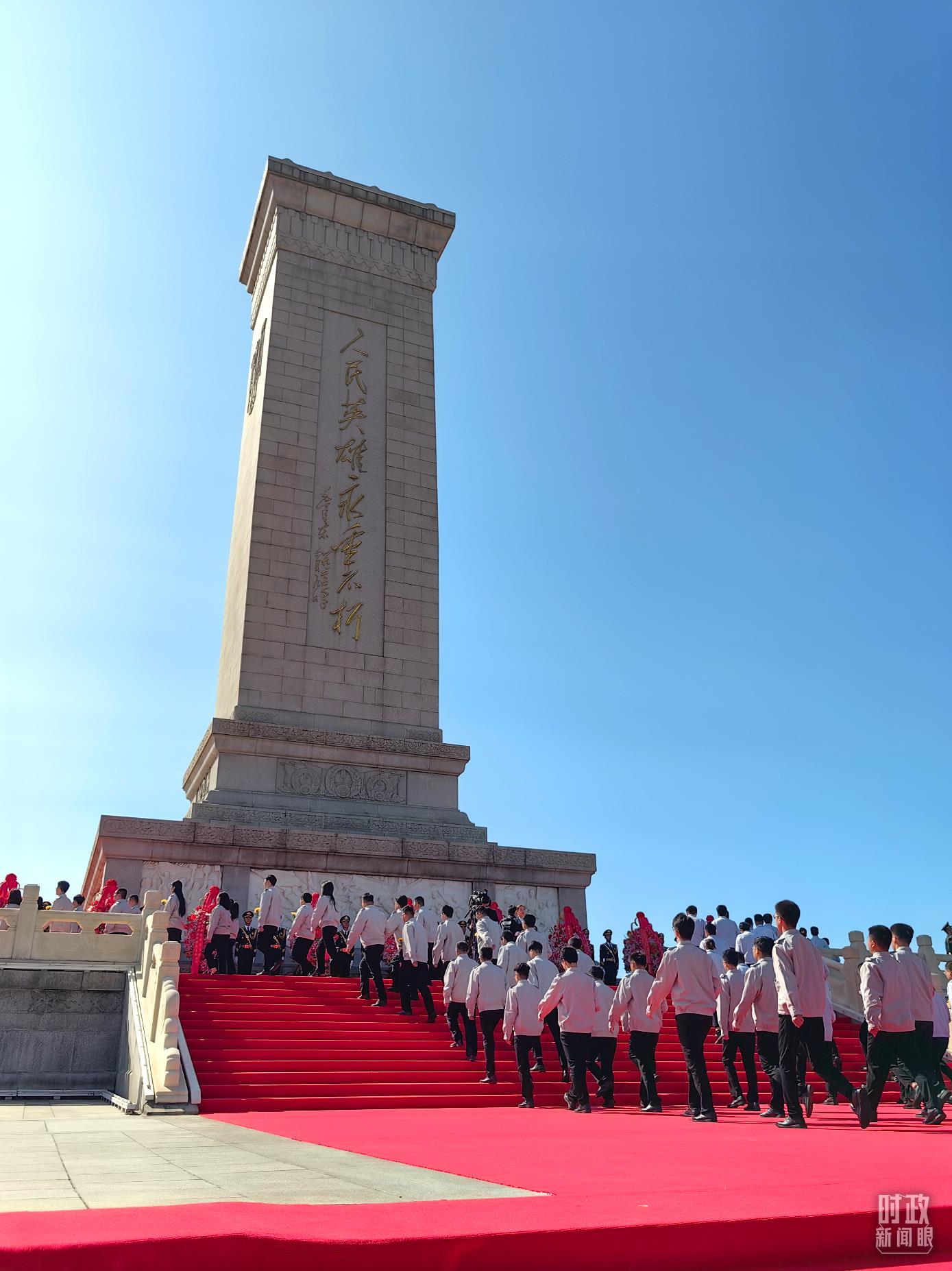 △禮兵抬起花籃,緩步走向人民英雄紀念碑。(總臺央視記者蔣碩、國廣記者李晉拍攝)