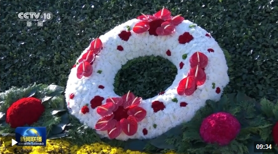 △儀式現(xiàn)場共有18個由白菊等鮮花組成的花環(huán)。(總臺央視記者趙化拍攝)