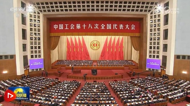 人民大會堂大禮堂氣氛熱烈。主席臺上方懸掛著“中國工會第十八次全國代表大會”的會標,后幕正中象征著中國工會和中國工人階級團結統(tǒng)一的工會會徽熠熠生輝,10面紅旗分列兩側。二樓眺臺懸掛著“堅持以習近平新時代中國特色社會主義思想為指導,全面貫徹黨的二十大精神,組織動員億萬職工為全面建設社會主義現(xiàn)代化國家、全面推進中華民族偉大復興團結奮斗!”的巨型橫幅。