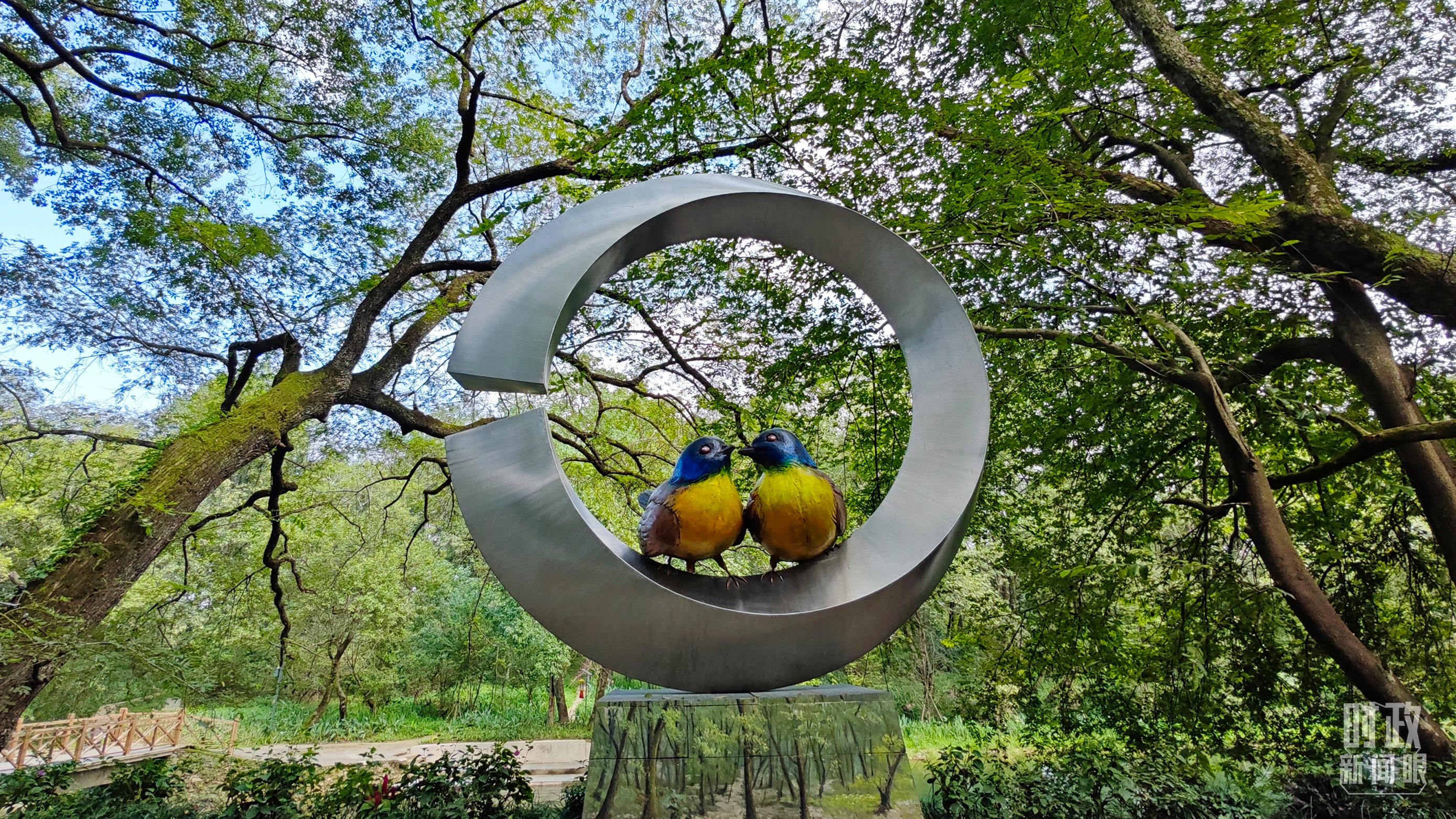 △石門村里的藍冠噪鹛雕像。(總臺央視記者許永松拍攝)