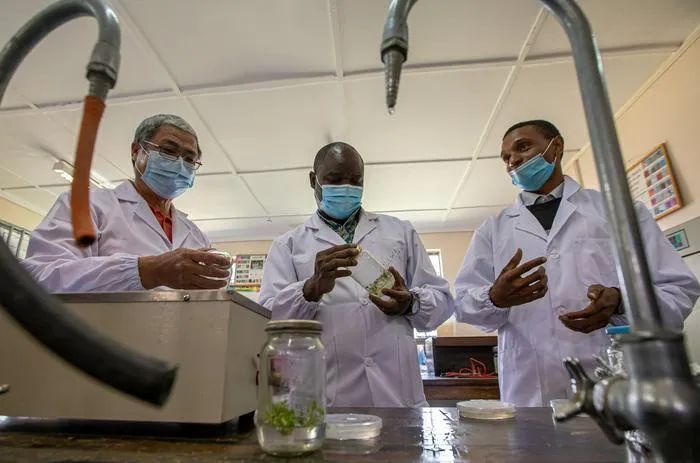 △2021年6月25日,肯尼亞,來自中國的農(nóng)學(xué)教授與肯尼亞農(nóng)業(yè)專家、肯方研究生在實驗室內(nèi)交流實驗成果。