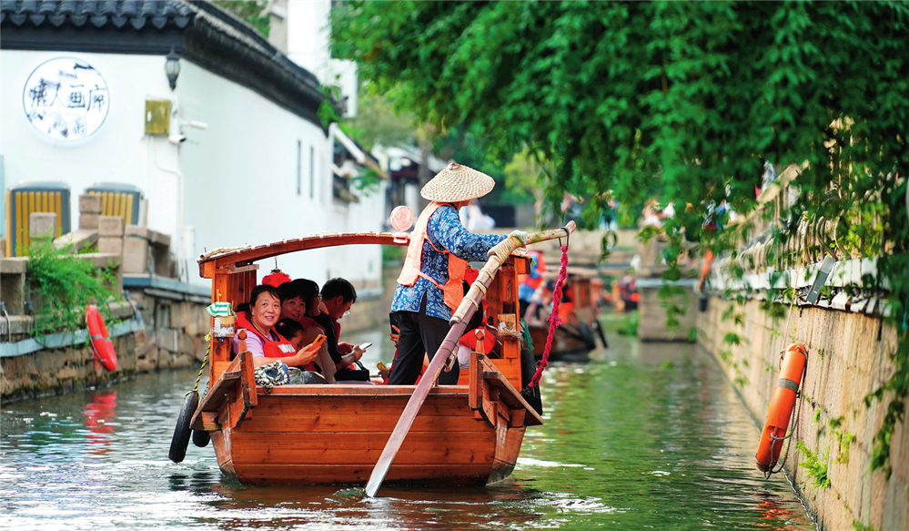 游客乘船在蘇州平江歷史文化街區(qū)休閑游玩(2023年7月3日攝)。李博攝/本刊