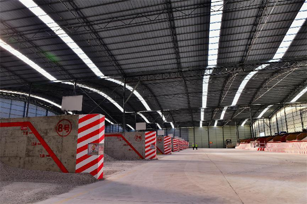 項(xiàng)目施工,拌和站建設(shè)必是首當(dāng)其沖。5、8標(biāo)拌和站建設(shè),大門劃分出分流道,使人車各行其道;設(shè)置保安室、門禁系統(tǒng),實(shí)行嚴(yán)格管里;劃分拌和作業(yè)區(qū)、材料堆放區(qū)及運(yùn)輸車輛停放區(qū),起到有序作業(yè);站區(qū)設(shè)置自動噴淋洗車池、廢水沉淀池,布設(shè)排水系統(tǒng);拌和站四周設(shè)置圍墻圍欄,安裝視頻監(jiān)控系統(tǒng),實(shí)行封閉式、可視式實(shí)時(shí)管理;水泥拌和樓主體全封包,上料倉加蓋雨棚,除上料這面外,其它三面圍閉,且料倉間擋板延伸至雨棚頂,徹底隔斷串料隱患。料倉配備自動識別噴霧除塵設(shè)備,有效防止粉塵擴(kuò)散,降低空氣污染;配備粗集料水洗設(shè)備,洗去微量的石粉和雜質(zhì),提高砂石的質(zhì)量。在此基礎(chǔ)上,兩家項(xiàng)目部各有創(chuàng)新亮點(diǎn)。