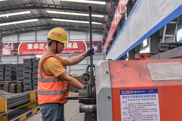 作為臨建標(biāo)準(zhǔn)化建設(shè)的重要標(biāo)志,桂鐘5、8標(biāo)段的鋼筋加工廠,廠房高度12米,作業(yè)場地平整、硬化。加工場內(nèi)醒目位置都設(shè)置工程公示牌、施工平面布置圖、安全生產(chǎn)牌、消防保衛(wèi)牌、管理人員名單及監(jiān)督電話牌、文明施工牌等明示標(biāo)志。加工廠內(nèi)按照功能設(shè)立了原材料堆放區(qū)、鋼筋下料區(qū)、加工制作區(qū)、鋼筋籠預(yù)拼接區(qū)、半成品堆放區(qū);還設(shè)置安裝了龍門數(shù)控切割機(jī)、全自動數(shù)控液壓鋼筋調(diào)直切斷機(jī)、鋼筋快速鋸床、數(shù)控鋼筋彎曲機(jī)、數(shù)控鋼筋調(diào)直機(jī)、數(shù)控鋼筋彎箍機(jī)、數(shù)字化工業(yè)焊接機(jī)器人、數(shù)控滾籠焊機(jī)、數(shù)控立式彎曲中心、全自動數(shù)控彎箍機(jī)、鋸切套絲打磨生產(chǎn)線等等機(jī)械化、數(shù)字化設(shè)備并懸掛著機(jī)械操作安全規(guī)定公示牌和設(shè)備標(biāo)示牌。這些工裝工藝標(biāo)準(zhǔn)化為項(xiàng)目部標(biāo)準(zhǔn)化建設(shè)賦能。
