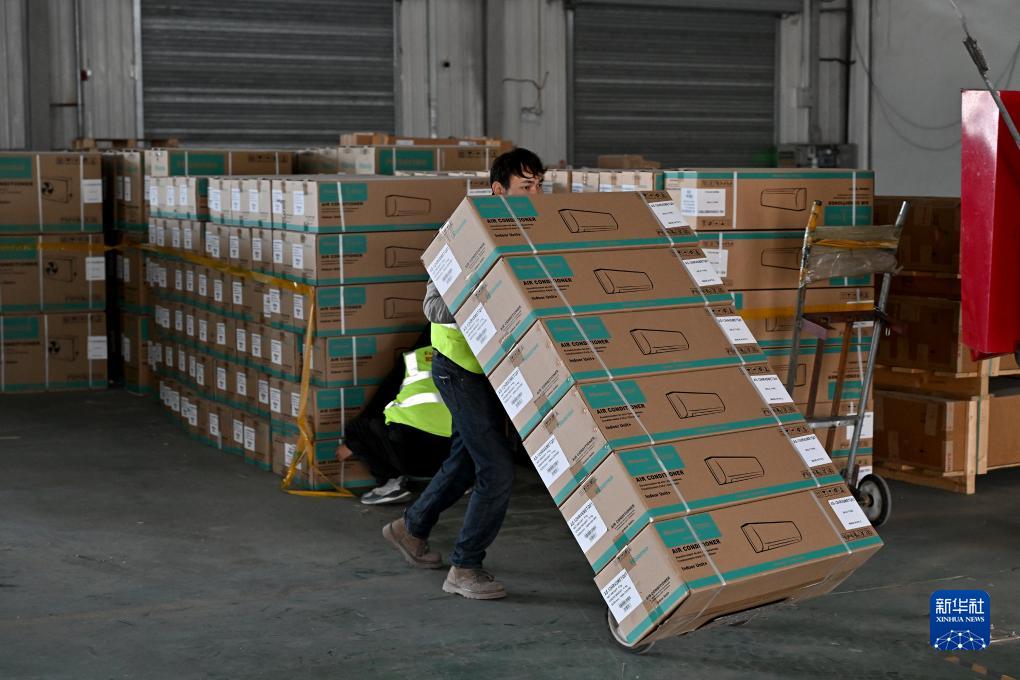 11月4日,在阿拉山口綜合保稅區(qū)內(nèi)的跨境電子商務(wù)分揀清關(guān)中心,工作人員將國(guó)產(chǎn)空調(diào)裝車準(zhǔn)備運(yùn)往國(guó)外。新華社記者 李鑫 攝