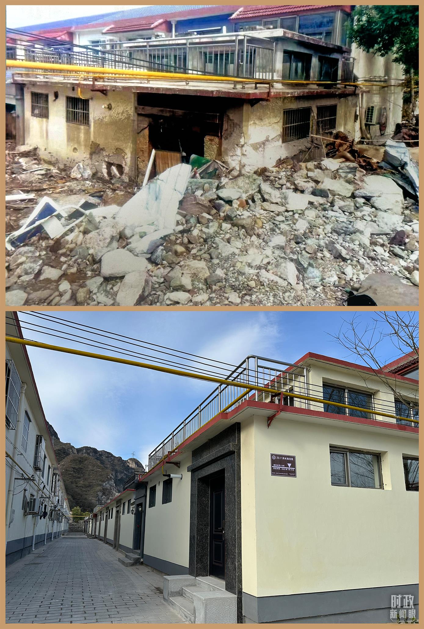 △ 村民房屋遭遇洪災(zāi)與災(zāi)后重建的對(duì)比圖。(總臺(tái)央視記者范一鳴拍攝)
