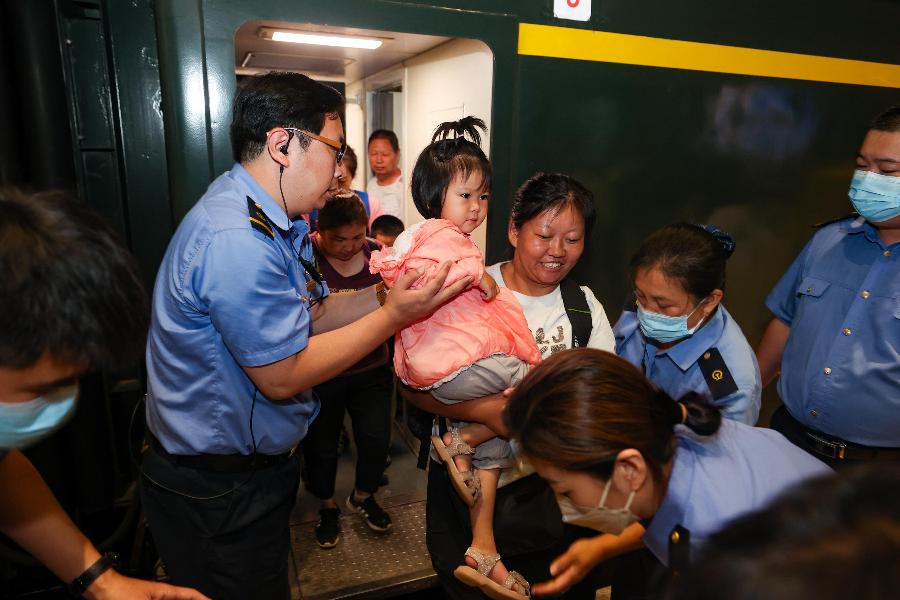 △2023年8月2日,因強降雨被困的K396次列車第二批近500名旅客在救援隊的一路護送下,徒步五個小時抵達妙峰山鎮(zhèn)水峪嘴村。稍作休整后,他們乘坐臨時旅客列車前往北京豐臺站。