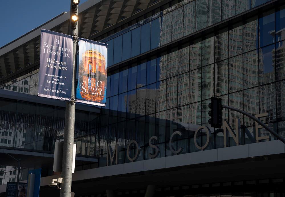 △近日,美國舊金山亞太經(jīng)合組織會議場地外的宣傳海報。