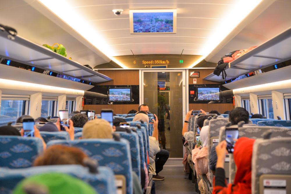 △2023年11月5日,在行駛中的雅萬高鐵高速動車組列車車廂內(nèi),乘客紛紛用手機拍攝顯示列車時速達到350公里的電子屏。