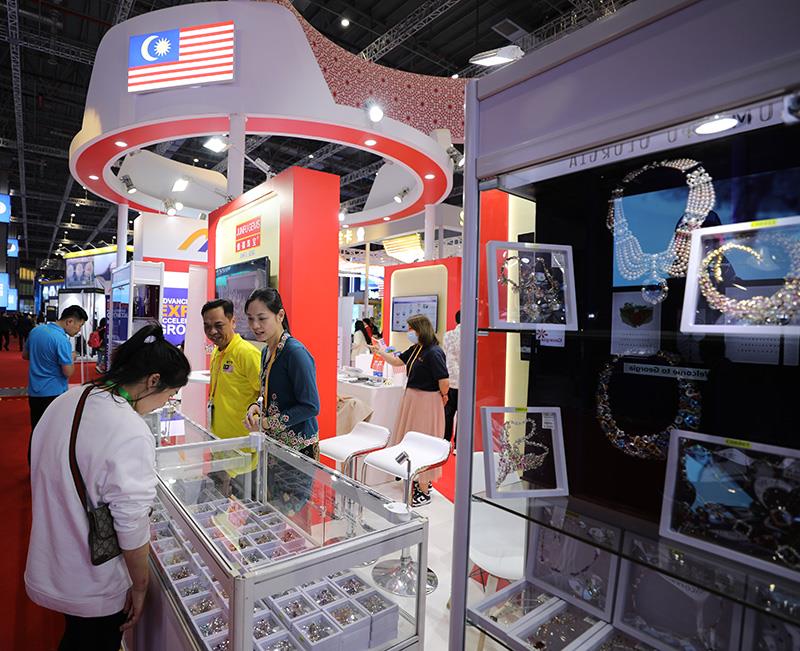 △2023年11月6日,參觀者在第六屆進博會國家展馬來西亞展臺欣賞展出的珠寶首飾。