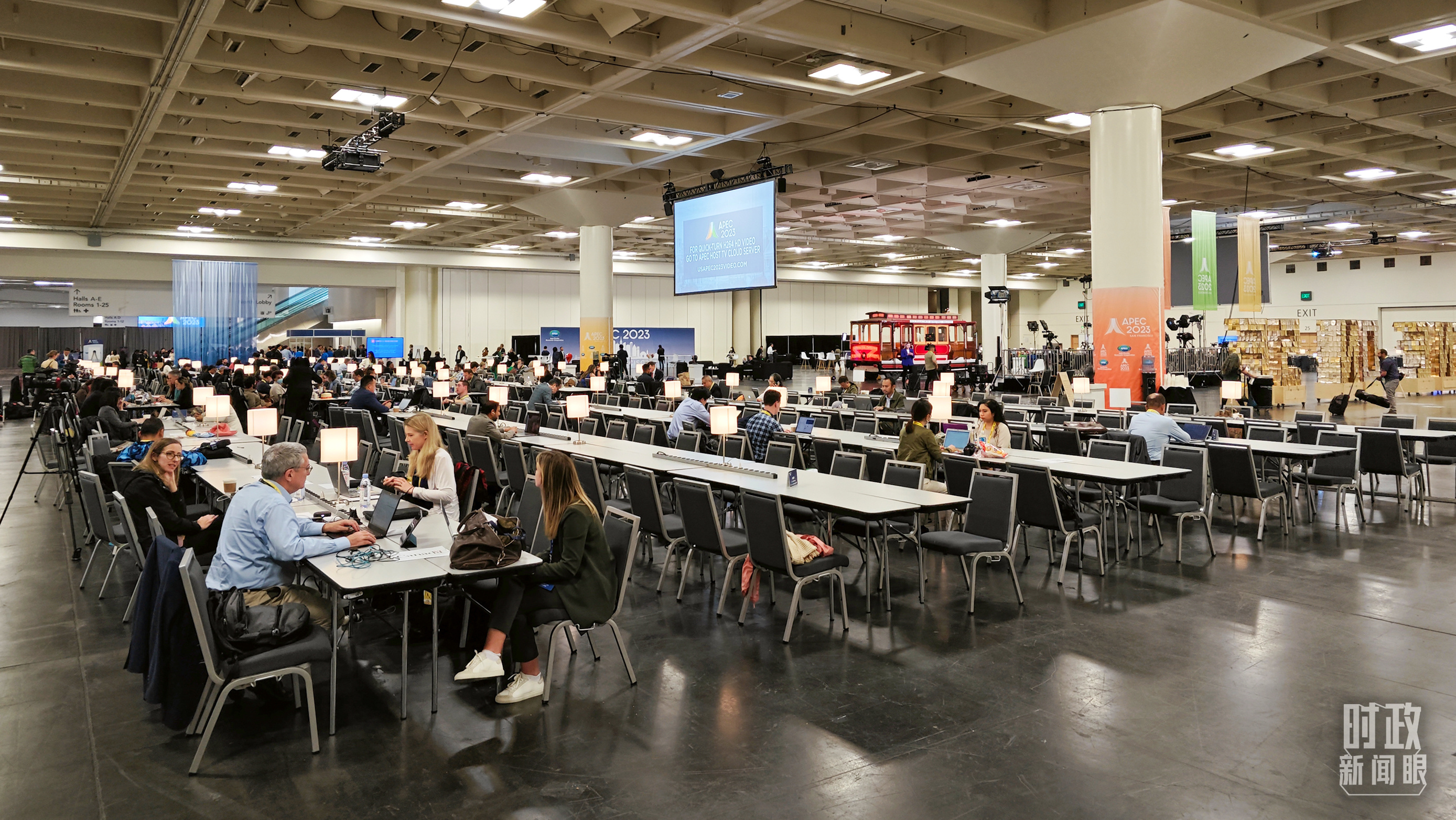 △APEC會(huì)議國際媒體中心,各國記者正在工作。(總臺(tái)央視記者王哈男拍攝)