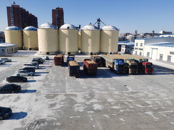 黑龍江立呈大豆蛋白有限公司廠區(qū)內(nèi),送糧的車輛等待卸車。新華社記者孫曉宇 攝