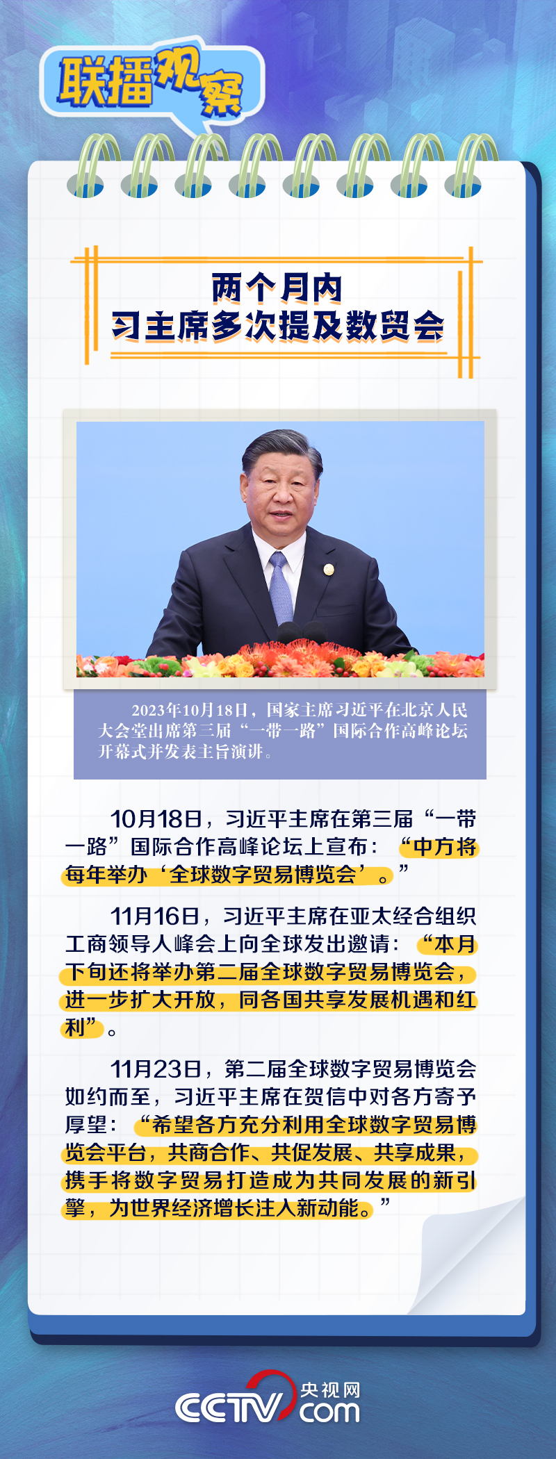 聯(lián)播+“當(dāng)前,全球數(shù)字貿(mào)易蓬勃發(fā)展,成為國際貿(mào)易的新亮點(diǎn)。”11月23日,習(xí)近平主席向第二屆全球數(shù)字貿(mào)易博覽會致賀信,回顧了近年來中國為全球數(shù)字貿(mào)易蓬勃發(fā)展付出的努力,并對與會各方寄予厚望。