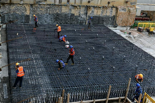 照此安排,項(xiàng)目部各部門、作業(yè)隊(duì)既各自為戰(zhàn),又協(xié)調(diào)統(tǒng)一,按區(qū)域、分專業(yè)、依先后齊頭并進(jìn)。筆者在地面施工區(qū)域看到,盾構(gòu)井臨時(shí)封堵板的鋼筋綁扎已經(jīng)完成,8名作業(yè)人員和監(jiān)理、技術(shù)人員在做最后的檢查,混凝土罐車、泵車嚴(yán)陣以待……不一會(huì)兒,混凝土順著管子就流向了鋼筋網(wǎng)內(nèi),4名振搗工也隨之開始忙碌,嗡嗡聲響成一片。車站1號(hào)鋼筋場(chǎng),10幾名穿著印有“鋼筋工”“信號(hào)司索工”馬甲的工人,或協(xié)助吊車調(diào)運(yùn)鋼筋、或切割鋼筋原材下料;不遠(yuǎn)處,吊車調(diào)運(yùn)明挖段鋼支撐轉(zhuǎn)場(chǎng)……