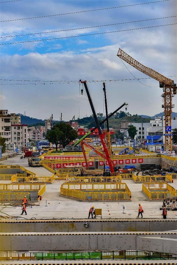 據(jù)項(xiàng)目部常務(wù)副經(jīng)理吳躍華介紹,白坭坑站目前投入電動(dòng)抓斗3臺(tái)、長(zhǎng)臂挖掘機(jī)1臺(tái),短臂挖機(jī)6臺(tái)、25噸汽車起重機(jī)3臺(tái),100噸汽車起重機(jī)1臺(tái)、塔吊2臺(tái)、土方運(yùn)輸車40臺(tái),各工種作業(yè)人員400人。日平均出土量約2000立方米、綁扎制作鋼筋45噸。