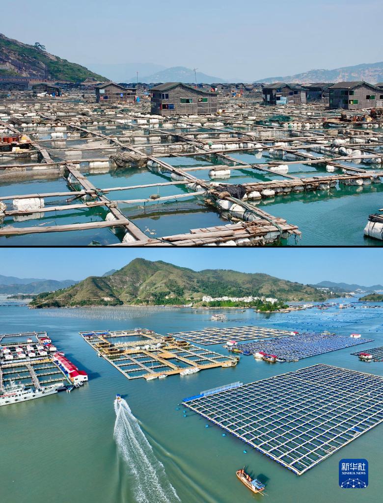 拼版照片:上圖為2007年7月拍攝的福建寧德三都澳海域傳統(tǒng)漁排(資料照片);下圖為2023年11月18日拍攝的福建寧德七星海域升級改造后的漁業(yè)養(yǎng)殖區(qū)(無人機(jī)照片,新華社記者姜克紅攝)。新華社發(fā)