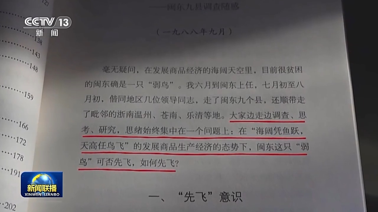 在一個(gè)多月里,習(xí)近平去了古田、屏南等9個(gè)縣的13個(gè)鄉(xiāng)鎮(zhèn)、18個(gè)村。隨后,他在《弱鳥(niǎo)如何先飛》這篇文章里寫(xiě)道:大家邊走邊調(diào)查、思考、研究,思緒始終集中在一個(gè)問(wèn)題上,在“海闊憑魚(yú)躍,天高任鳥(niǎo)飛”的發(fā)展商品生產(chǎn)經(jīng)濟(jì)的態(tài)勢(shì)下,閩東這只“弱鳥(niǎo)”可否先飛,如何先飛?