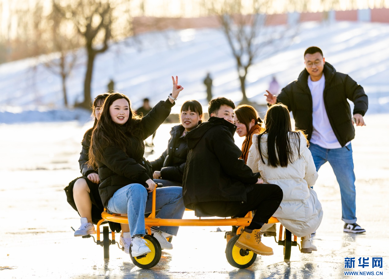 12月7日,游客在呼和浩特市玉泉區(qū)大庫倫村“冰雪大世界”內(nèi)體驗多人冰車。新華網(wǎng)發(fā)(丁根厚 攝)