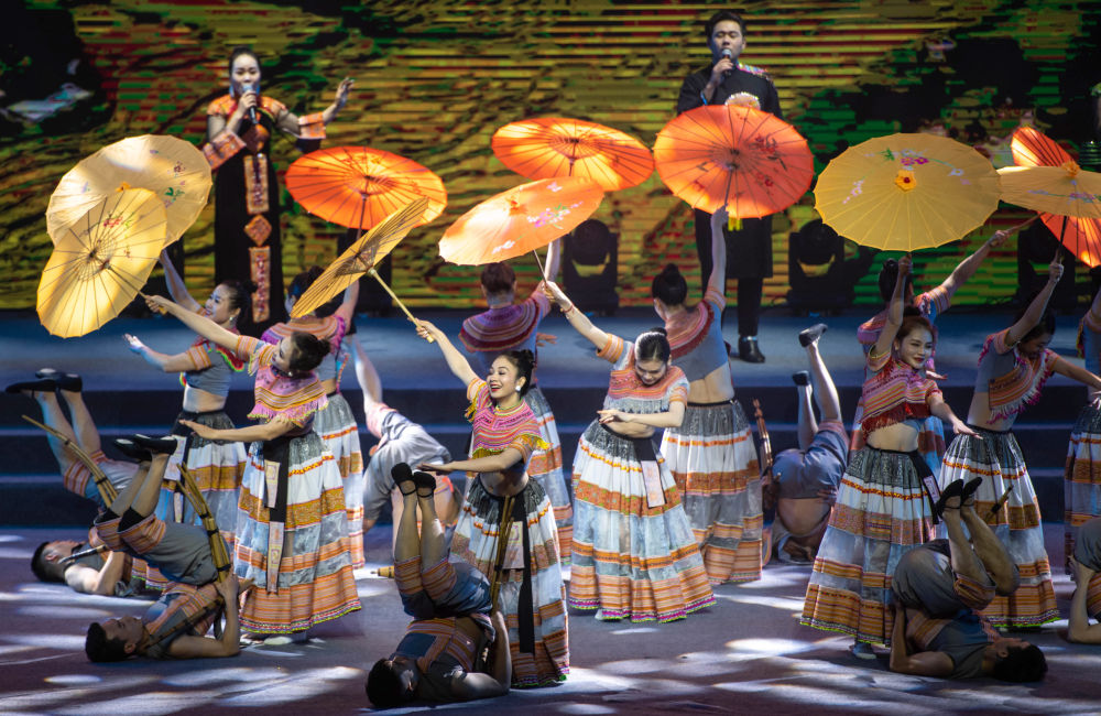 2023年1月18日,以“同心筑厚誼 攜手共發(fā)展”為主題的2023年中越跨國(guó)春節(jié)聯(lián)歡晚會(huì)在云南省紅河哈尼族彝族自治州河口瑤族自治縣舉行,越南老街省民族藝術(shù)歌舞團(tuán)的演員在晚會(huì)上表演歌舞《漂浮在云端的節(jié)日》。新華社記者 胡超 攝