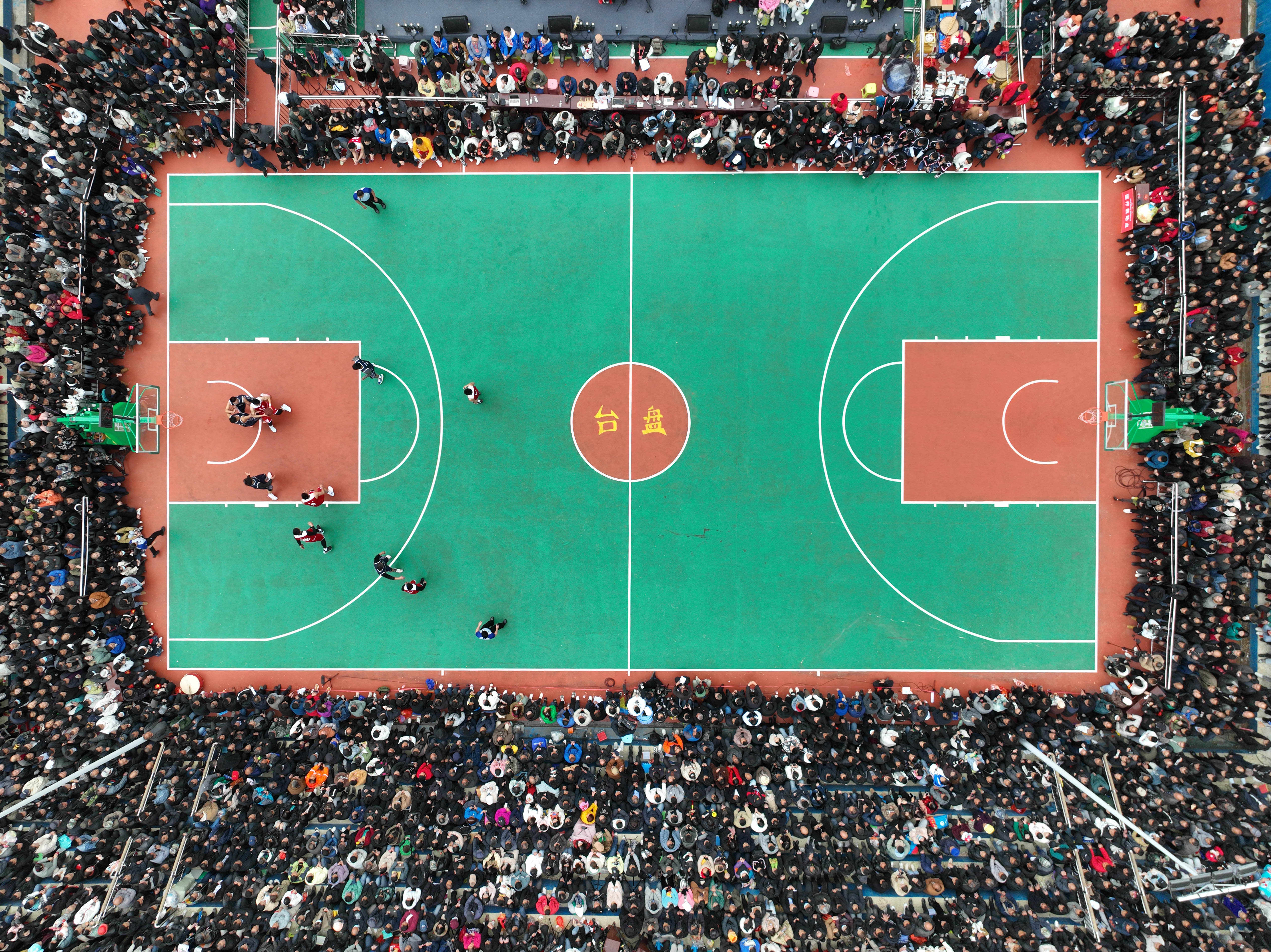這是2023年3月27日在貴州省黔東南州臺江縣臺盤村拍攝的貴州省首屆“美麗鄉(xiāng)村”籃球聯(lián)賽總決賽比賽現(xiàn)場(無人機(jī)照片)。新華社記者 歐東衢 攝
