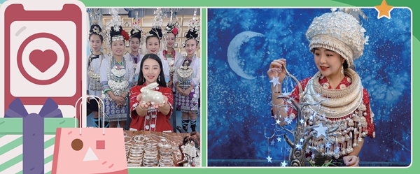 左:潘雪和村子里的女孩一起直播推介苗族銀飾。右:潘雪正在整理銀飾。受訪者供圖