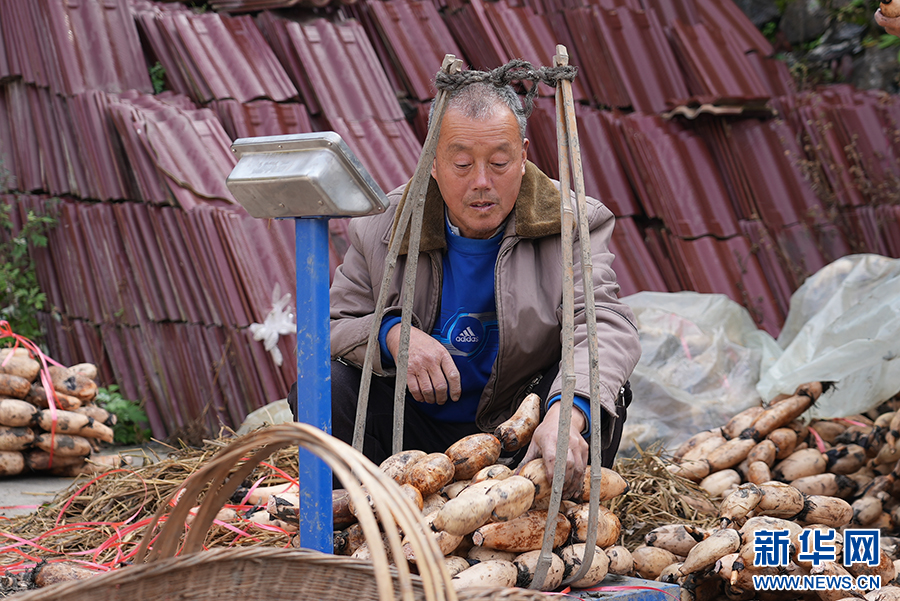 冬日,在石泉縣城關(guān)鎮(zhèn)絲銀壩村草池灣一處農(nóng)家小院里,一位老者捆扎蓮藕。新華網(wǎng) 楊喜龍 攝