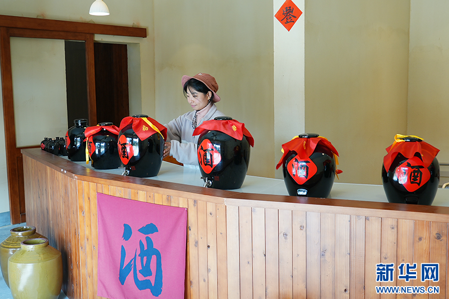 冬日,在石泉縣城關(guān)鎮(zhèn)絲銀壩村草池灣米酒工坊,工作人員整理柜臺。新華網(wǎng) 楊喜龍 攝