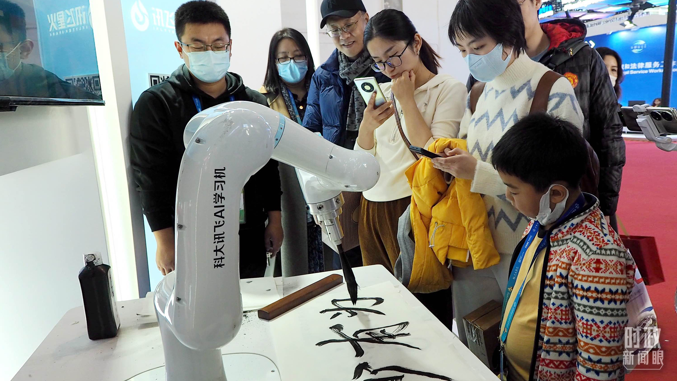 △觀眾在首屆鏈博會(huì)上體驗(yàn)AI書(shū)法機(jī)器人。(圖/視覺(jué)中國(guó))