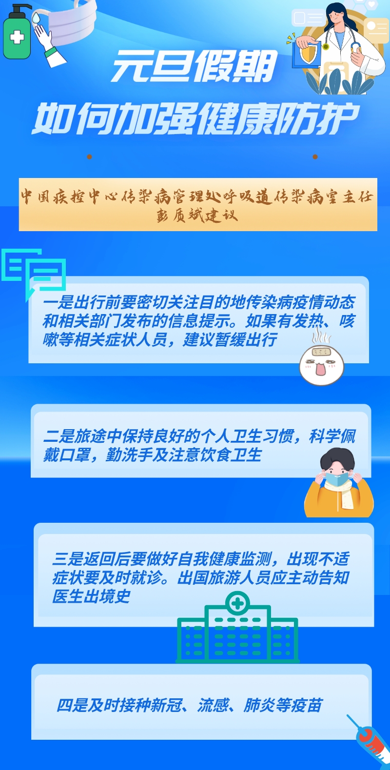 元旦假期中,人員流動增多,探親訪友、旅游出行、聚會聚餐等增加,呼吸道疾病傳播風(fēng)險(xiǎn)加大,做好健康防護(hù)至關(guān)重要。