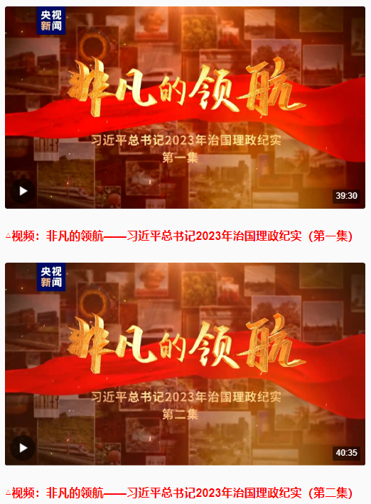 2024年1月1日,中央廣播電視總臺(tái)推出特別節(jié)目《非凡的領(lǐng)航——習(xí)近平總書(shū)記2023年治國(guó)理政紀(jì)實(shí)》,共兩集。