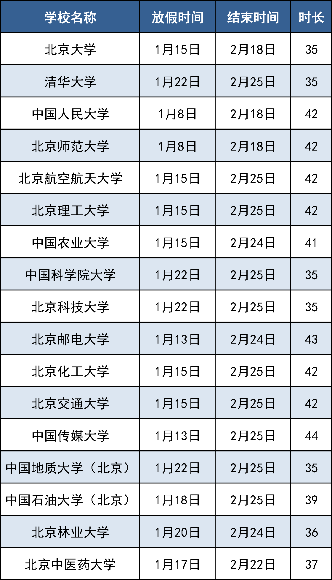 寒假在即,北京各大高校紛紛公布2024年寒假放假安排。北京大學(xué)、清華大學(xué)、中國人民大學(xué)等近40所高校公布的放假安排中,最長的假期達48天。