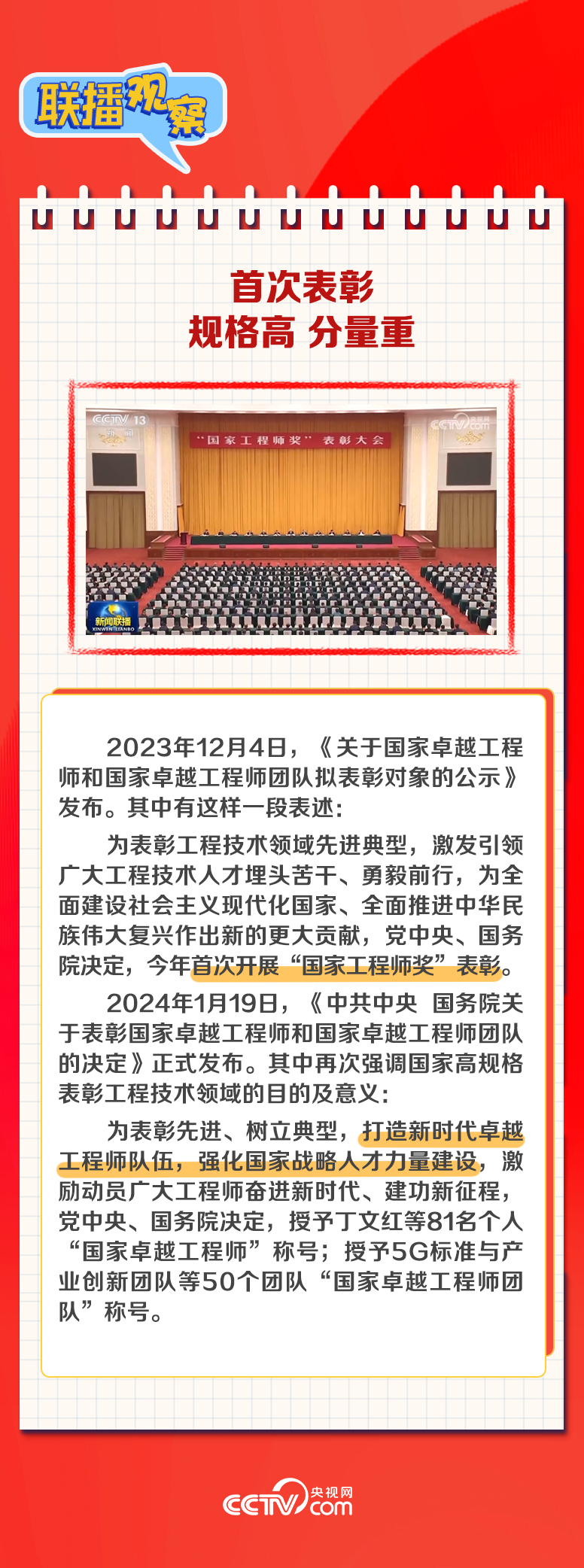 總書(shū)記對(duì)全國(guó)廣大工程技術(shù)人員提出哪些希望?獲獎(jiǎng)?wù)吆瞳@獎(jiǎng)團(tuán)隊(duì)因何上榜?“國(guó)家工程師獎(jiǎng)”獎(jiǎng)?wù)录?xì)節(jié)中藏著哪些奧秘?央視網(wǎng)《聯(lián)播觀察》帶您讀懂國(guó)家最高規(guī)格表彰工程技術(shù)領(lǐng)域先進(jìn)典型背后的深意。