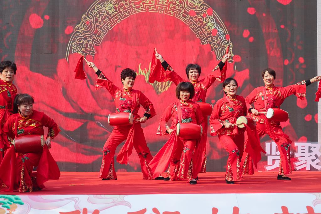 2023年12月28日,浙江省諸暨市趙家鎮(zhèn)村民在村晚舞臺(tái)上表演腰鼓。新華社記者 徐昱 攝
