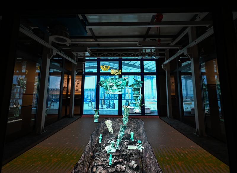 在三星堆博物館新館拍攝的裸眼3D技術(shù)還原的考古“方艙”。新華社記者王曦 攝