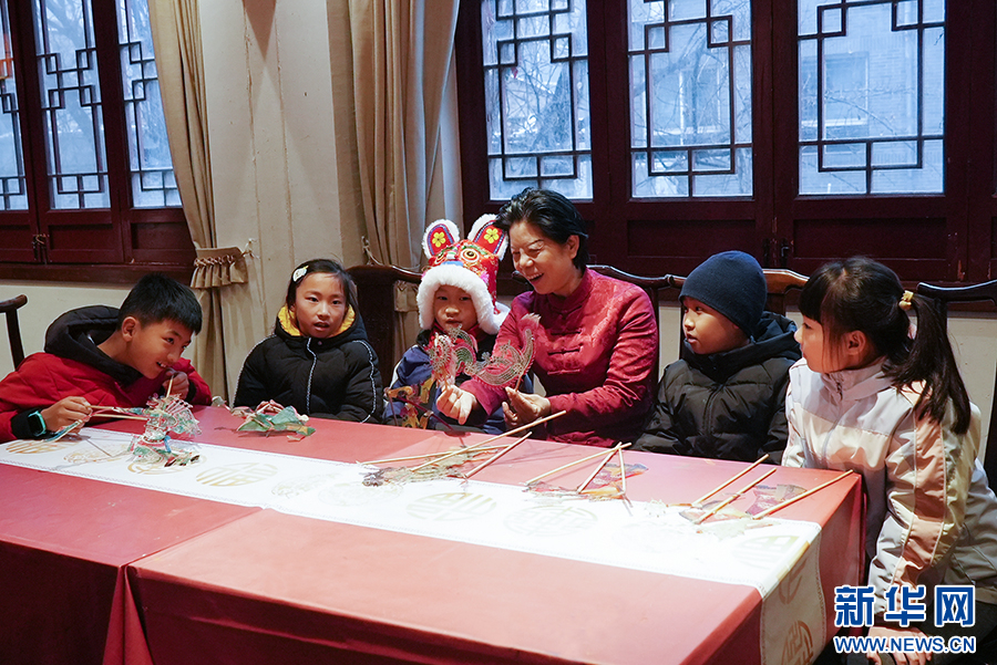 在西安永興坊——陜西非遺文化特色街區(qū),今年56歲的王春桃,為小朋友們表演國家級非遺合陽提線木偶戲《賣雜貨》。 新華網(wǎng) 楊喜龍 攝